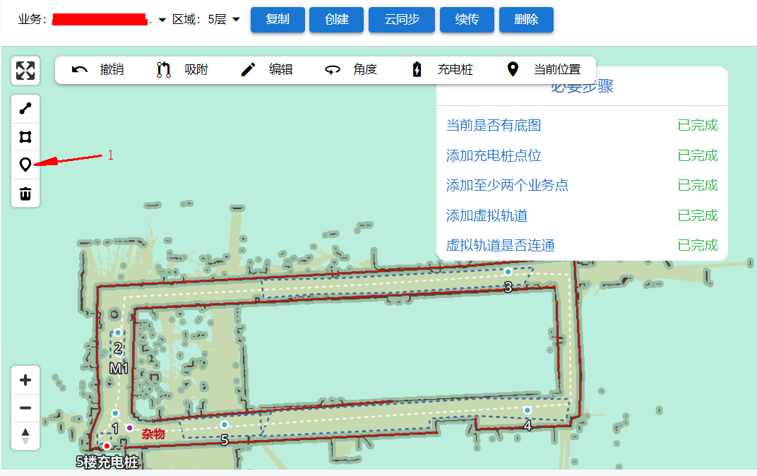 ⑨“删除”按钮可以删除当前编辑的业务地图,该地图为云端地图,同时会同步到底盘,底盘的业务地图也会被删除,机器人将无法使用该楼层地图。通过续传非业务地图的方式也可以恢复该楼层地图,但需要重新编辑点线面。